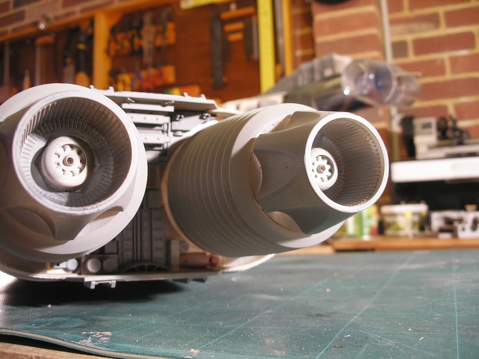 There is a block of wood on the top of the thorax that the engine section support strut fits over to locate it. There is also wire with some 4mm connectors to hook up the eventual engine lights( not shown). you can see the wires inside the engines ready for the bright LED down lights I intend to use.