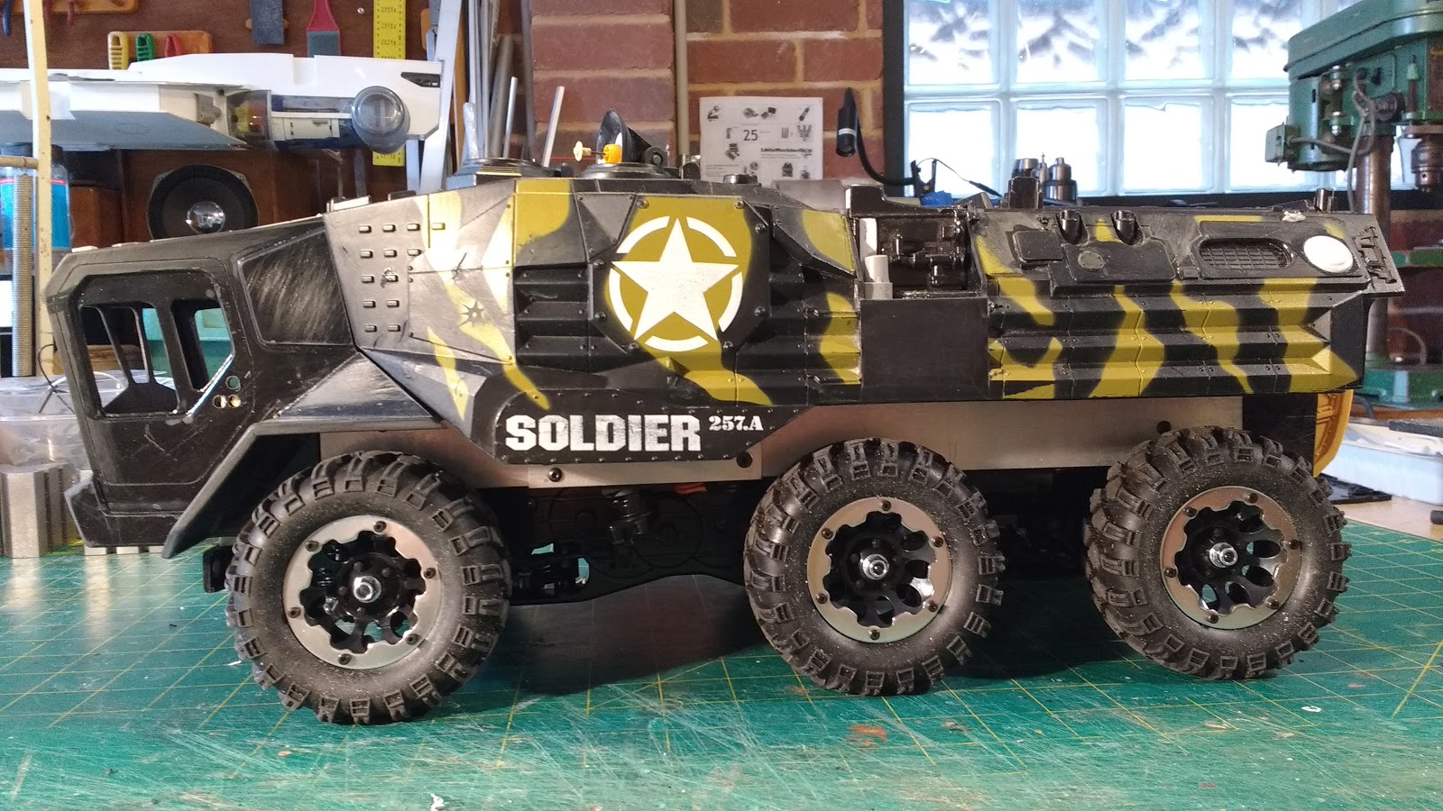 I added a couple of lengths of aluminium angle to the Tamiya chassis using the existing side protrusions, the front and rear needed some PVC rod spacers. This provides a level platform to attach the body work. One side had to navigate around the front steering servo, so was made from three bits of angle bolted together with some 6mm PVC sheet spacers. The Kong Head comes with extra parts to make the rear most axle steer as well and improve the turning circle, which I made full use of adding a second servo. I purchased 4 so called 30kg servos from BangGood and in testing on a servo tester work very well, once mounted in the vehicle with the Tamiya ESC turned on however they twitch a fair bit at idle. I might try a separate bec to see if that cures the problem.