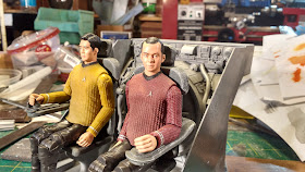 Before I built the console I started on a cabin interior and seats. Two 1/12 scale Star trek figures, John Cho and Simon Pegg to be precise, (though the Simon Pegg face does not really resemble him at all) will occupy the chairs as planned 4 years ago. The seats are made from Foamed PVC sheet, 10mm and 3mm thickness. I hacked away at the figures thighs to get them to sit properly and drilled a hole through their torsos so they can be securely screwed to the chairs under their silicon jumpers.